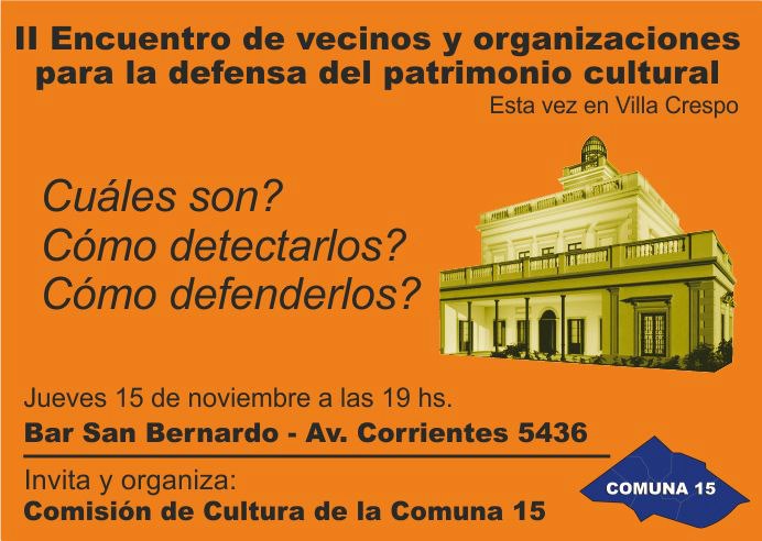 ABANDONADOS Por Elena Luz González Bazán especial para Villa Crespo Digital 22 de noviembre del 2012 Se creó un sitio por internet donde se pueden denunciar los autos abandonados que se encuentren en los barrios de la Comuna 15. SE REALIZO LA NOVENA REUNIÓN DEL CCC Por Elena Luz González Bazán especial para Villa Crespo Digital 21 de noviembre del 2012 Por la Redacción de Villa Crespo Digital 13 de noviembre del 2012 PATRIMONIO CULTURAL DE VILLA CRESPO ENCUENTRO POR EL PATRIMONIO CULTURAL DE LA COMUNA 15 EN VILLA CRESPO Por Elena Luz González Bazán especial para Villa Crespo Digital 13 de noviembre del 2012 Este jueves 15 de noviembre a las 19 horas, en el Bar San Bernardo, ubicado en avenida Corrientes 5436, se desarrollará el encuentro sobre el patrimonio cultural en la Comuna 15. Está organizado por la Comisión de Cultura del Consejo Consultivo Comunal y estarán presente Mónica Capano, exSecretaria de la Comisión para la Preservación del Patrimonio Histórico Cultural de la Ciudad de Buenos Aires y Cristina Sottile. Los temas serán: ¿Cómo defender el patrimonio cultural de los barrios que conforman la Comuna 15, en este caso? ¿Qué es el patrimonio cultural? ¿Cómo identificar sitios en peligro? ¿Cómo proteger el patrimonio tangible e intangible? ¿Qué es lo que pueden hacer los vecinos y las organizaciones? Desde este portal, siempre sostuvimos la necesidad de la defensa del Patrimonio cultural del barrio de Villa Crespo, de la Comuna 15, de la Ciudad y del país. Defendimos desde nuestro portal todo el patrimonio que debe ser preservado y pusimos sobre la realidad, cómo se preserva y se cuida en otros países de América Latina. No dudamos en sostener que con nuestro patrimonio actual se hace tabla rasa y poco interés existe desde los estamentos dirigentes hacia abajo, sobre el cuidado de la historia, la identidad y la memoria de los pueblos. Saludamos la iniciativa. FUENTES: Prensa del Consejo Consultivo Comunal 15. Caracteres: 1563