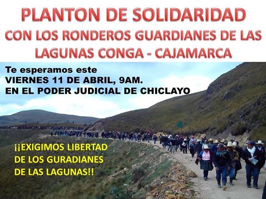 El 11 de abril del corriente año, a partir de las 9 horas se llevará adelante una movilización denominada: Plantón por la libertad de los Guardianes de las Lagunas que se dirigirá hacia el primer juzgado de instrucción preparatoria a cargo del juez Wilson Medina Medina, este es el juez que tenía a su cargo a 19 compañeros celendinos detenidos luego del 3 de julio del 2012 en donde nos asesinaron a 5 compañeros, dice el comunicado.