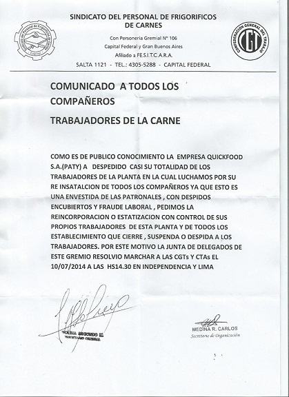 EL SINDICATO DEL PERSONAL DE FRIGORIFICOS DE CARNES LLAMA A LOS
