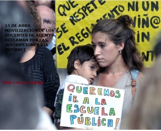 LOS DOCENTES SINDICALIZADOS EN ADEMYS SE MOVILIZARON CUESTIONAMIENTOS A LA INSCRIPCIÓN POR INTERNET LOS DOCENTES SINDICALIZADOS EN ADEMYS SE MOVILIZARON Por la Redacción de Villa Crespo Digital 16 de abril del 2015 Este miércoles 15 de abril, en horas de la tarde, los docentes nucleados en el sindicato de ADEMYS marcharon hacia la cartera Educativa de la Ciudad de Buenos Aires, el problema central es la inscripción por Internet, online.
