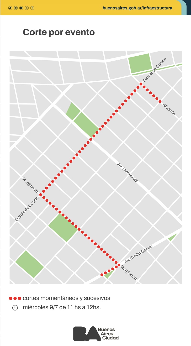 Albariño, entre Patrón y García de Cossio, pasando por Albariño, García de Cossio, Murguiondo, Emilio Castro hasta Emilio Castro 6391 y, cierres totales, momentáneos y sucesivos de las arterias transversales a la hora del paso de los peregrinos.
