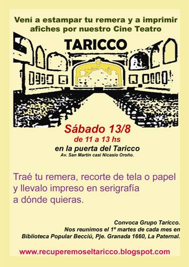 EL PEDIDO ES QUE LOS VECINOS DE LA COMUNA LLEVEN SU REMERA Y LA ESTAMPEN POR EL CINE TEATRO TARICCO, TAMBIÉN QUE IMPRIMAN AFICHES