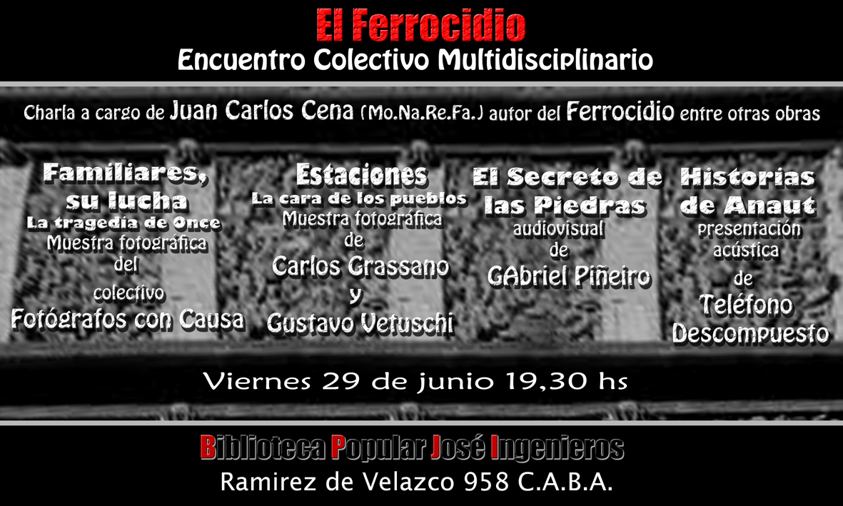 Este trabajo está dedicado al compañero Leonardo Andrada, ferroviario de estirpe, protagonista de la última huelga ferroviaria en 1991/199. Resistiendo las políticas de desguace y cerramiento del ferrocarril de Carlos Menem y la traición de los burócratas. Maquinista del F.C. Sarmiento, asesinado en la madrugada de día ocho de febrero de este año por ser honesto, valiente, solidario y coherente en todos sus comportamientos. El fue el que dio la alarma al compañero que lo relevaba en la estación Castelar, de que la formación que se estrelló en estación Once tenía freno largo, es decir, no tenía casi frenos. Cuando un accidente de estas características ocurre y es anunciado no es una anormalidad sino un crimen, murieron 52 personas y más de 800 accidentados.