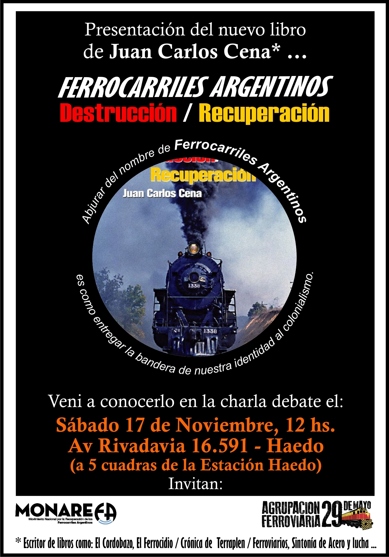 El próximo jueves 19 de abril del corriente año, a las 19 horas, en Humberto Primo y Catamarca, el grupo La Grupa organiza una charla sobre el tema del Ferrocarril, para tal charla se lo invitó a Juan Carlos Cena, experto en la materia, autor del libro EL FERROCIDIO entre otros.